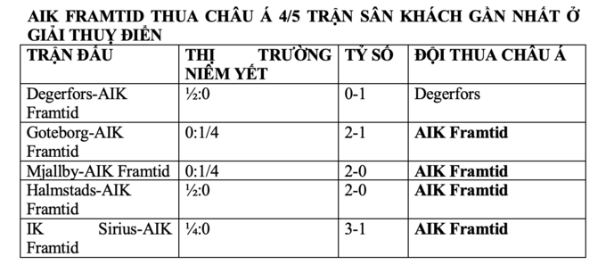 + AIK Solna không phải đội chơi tốt trên sân khách. Trong 8 trận sân khách gần nhất, AIK Solna đã thua châu Á 6 lần, chỉ 2 lần thắng châu Á. Kể từ tháng 6 tới nay, AIK Solna chưa từng thắng được 2 trận liền trên sân khách. Mà trong trận sân khách gần nhất thì họ đã có chiến thắng. Nói vậy để thấy AIK Solna không phải đội ổn định khi xa nhà.