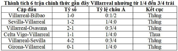 Tuy nhiên, cũng sau trận thua đó Villarreal đã trở lại mạnh mẽ và có mạch 3 trận thắng liên tiếp tại đấu trường La Liga theo cả chuyên môn và tỷ lệ châu Á. Cả 3 trận thắng đó của Villarreal đều chứng kiến mức tỷ lệ châu Á mà đội chủ nhà nhường đối thủ dao động từ 1/4 đến 3/4 trái.